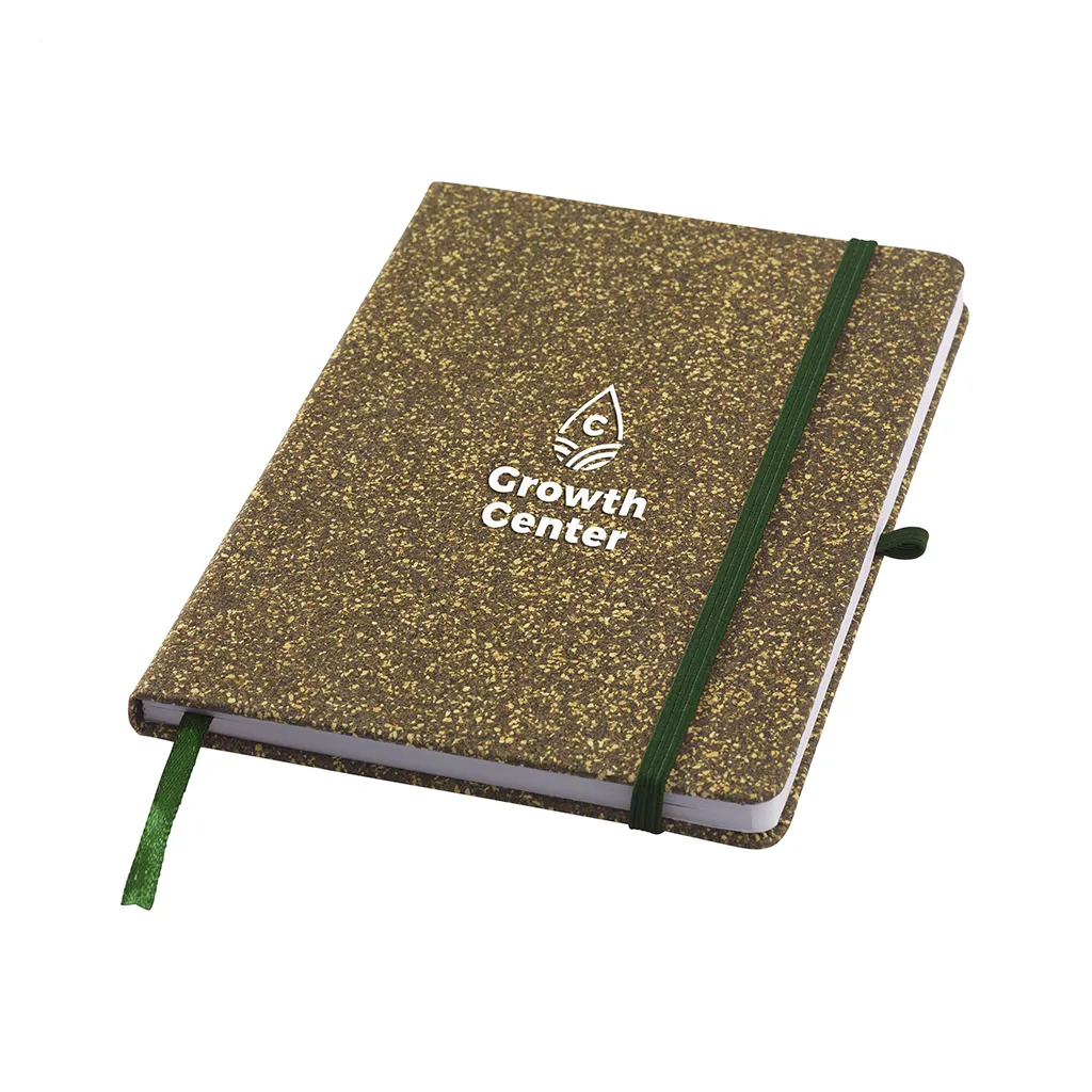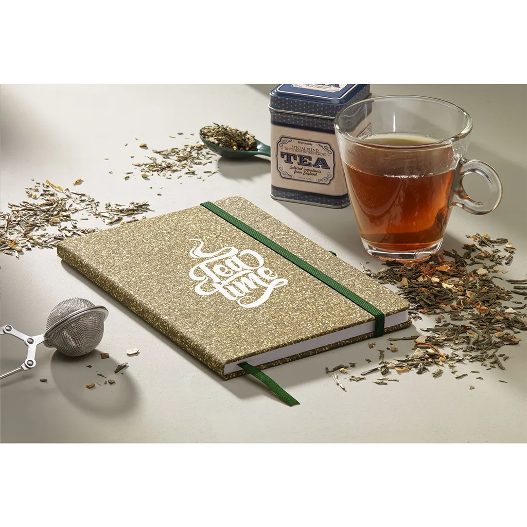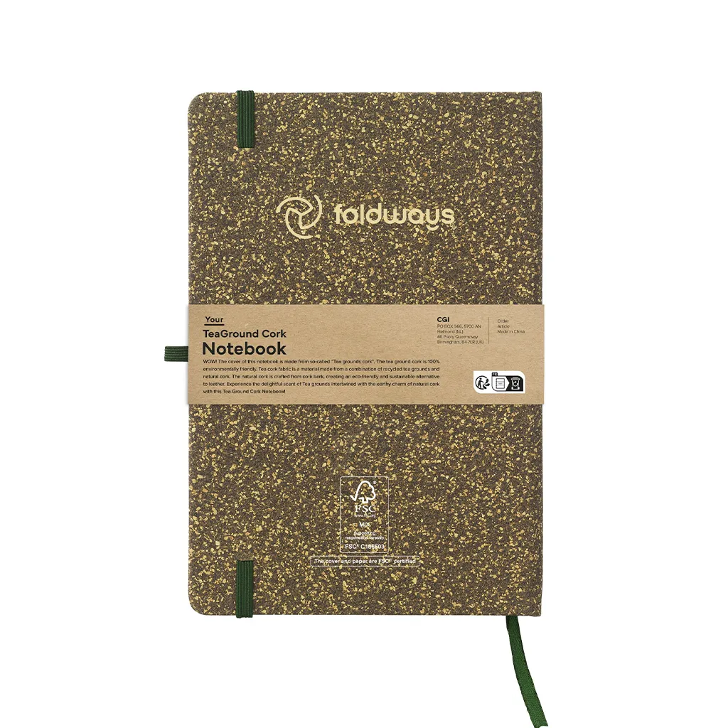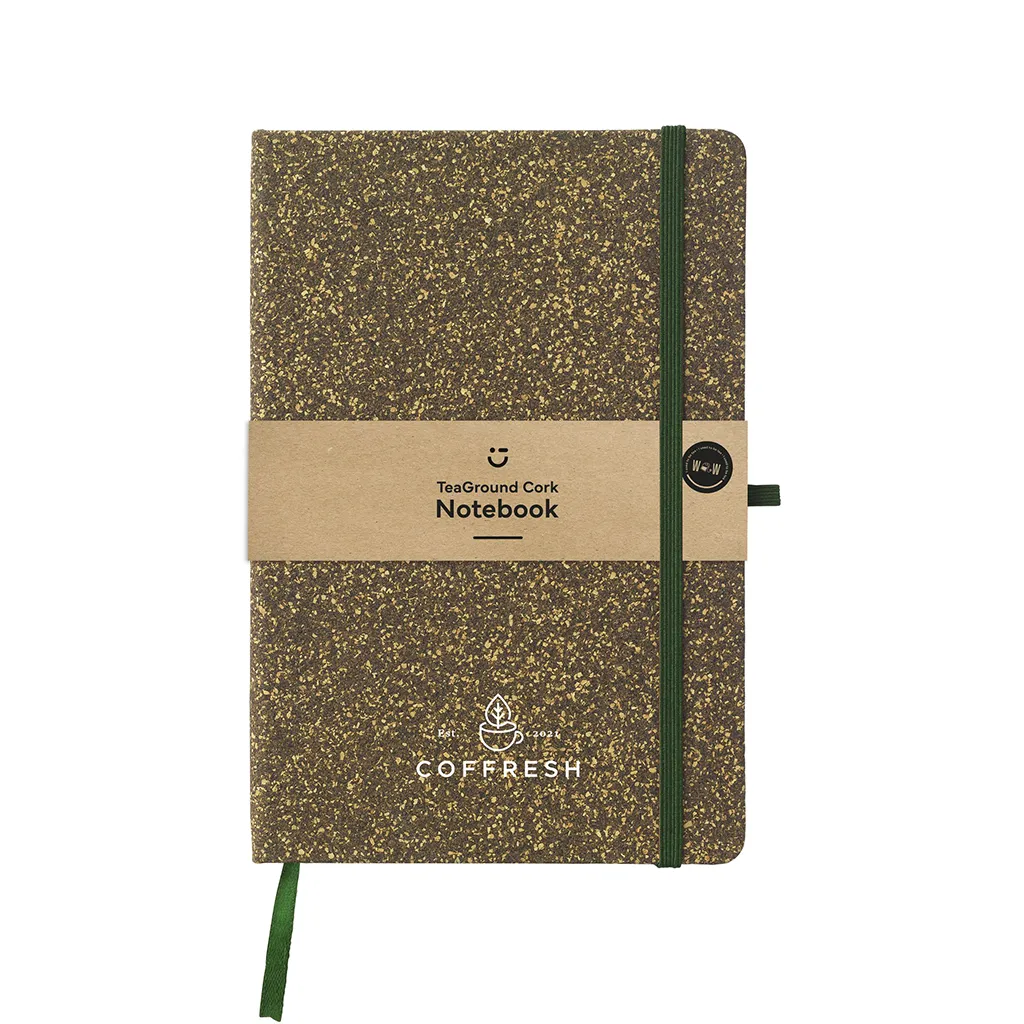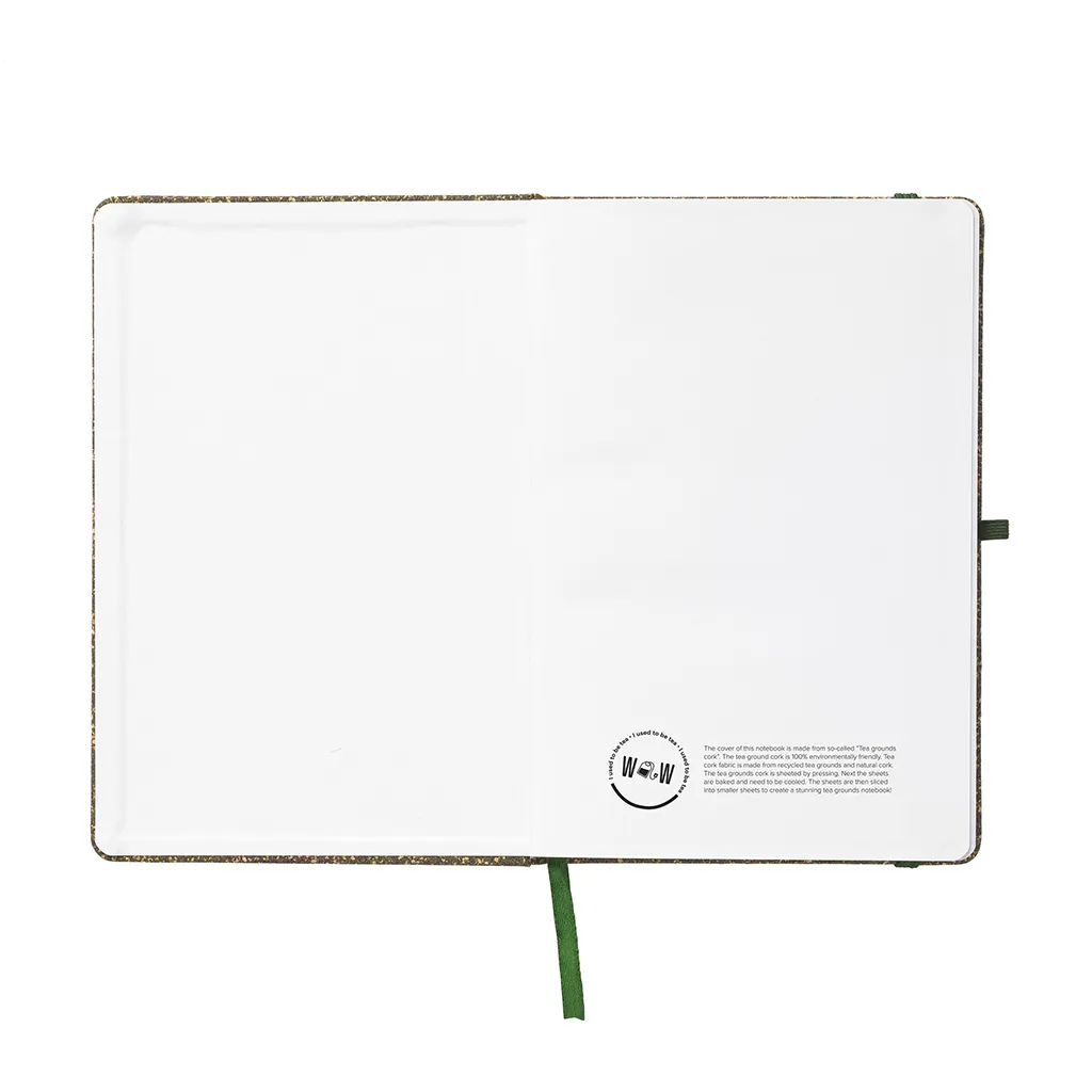 Корица от FSC сертифициран картон е покрита със смес от отпадъчни чаени листа, корк, полиестер и памук. Тази комбинация придава естествена текстура и уникален външен вид. Цветовете варират в зелено-кафяви тонове, което подчертава натуралния произход на материалите. Повърхността е здрава и гъвкава, предпазва страниците от износване и намачкване.