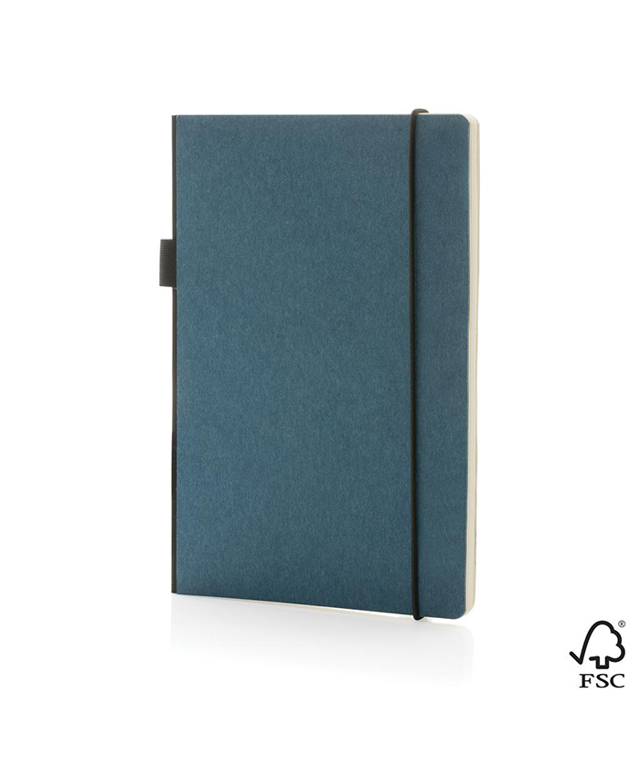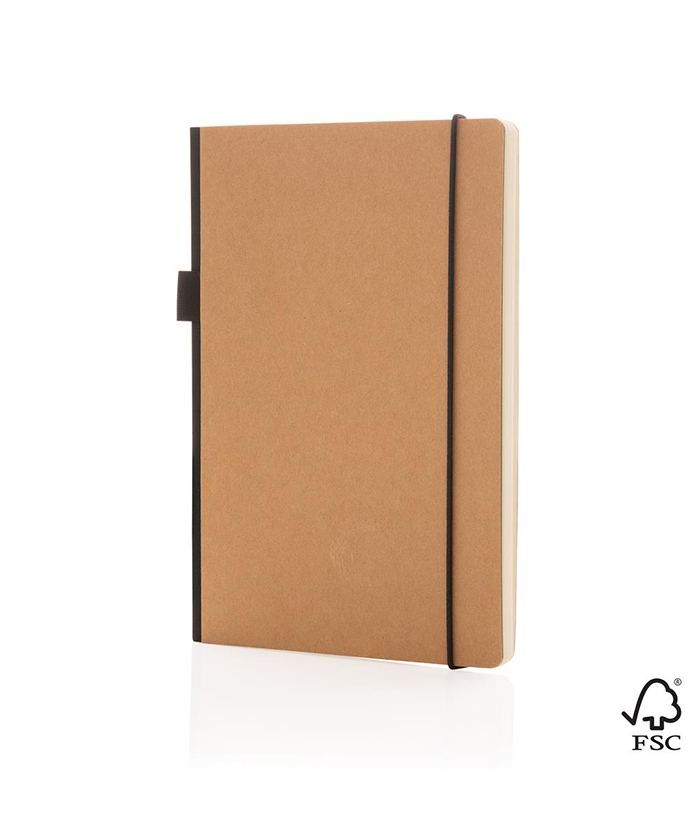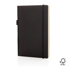 Този FSC® делукс тефтер разполага с FSC-сертифицирана твърда хартиена корица с еластична примка за писалка и отбелезалка за страници в подходящ черен цвят.