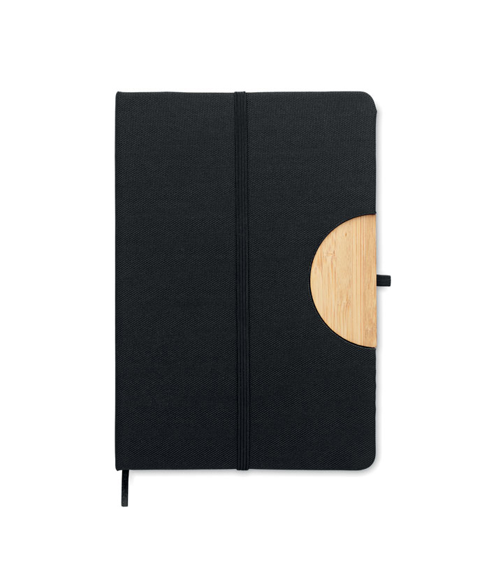 Бележник A5 с твърда корица от 600D RPET, с бамбуков детайл и стойка за смартфон.