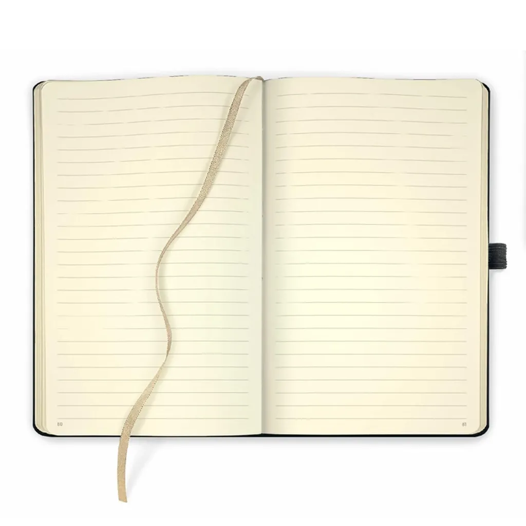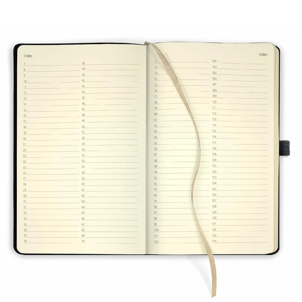 Тефтерът е компактен и гъвкав, което позволява лесно пренасяне в чанта или джоб без деформация. Висококачествената хартия с плътност 70 g/m² в цвят шампанско е FSC сертифицирана, осигурявайки устойчив избор и внимание към природните ресурси. Форматът A5 и 240-те страници предоставят удобно пространство за записки, идеи и планове, а интегрираната отметка помага бързо да се ориентирате в съдържанието.