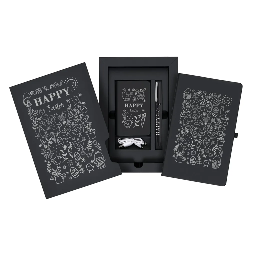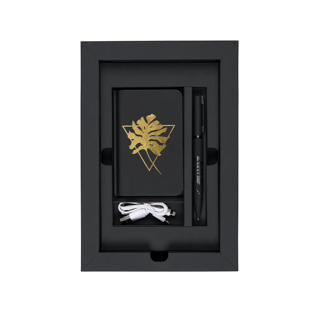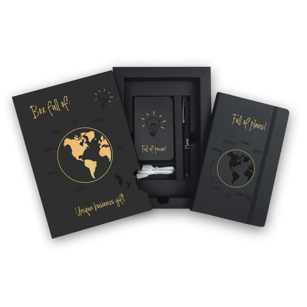 PowerBox Black предоставя възможност да създадете свой собствен комплект. Изберете конкретен модел тефтер, подходяща химикалка и капацитет на батерията според нуждите си. Всеки от елементите, включително и кутията, може да бъде персонализиран с графика, надпис или лого по ваш проект.