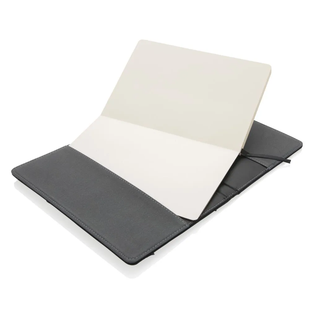 Корицата е изработена от устойчив материал и разполага с практичен джоб. В него могат да се съхраняват химикалка, мобилен телефон, карти или други дребни вещи. Дизайнът е проектиран с мисъл за динамичната работна среда и необходимостта от мобилност.